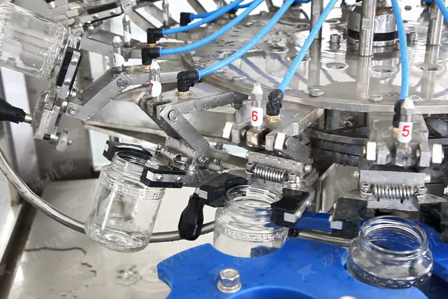 洗瓶机的过程是空瓶进入输瓶螺杆,由星轮传动到夹瓶工位,洗瓶的整个过程瓶底均悬空,其优点是着力点在瓶头和颈部,是瓶子厚硬的部分,在清洗过程中不会损伤或压扁,洗瓶机可调整多种瓶子,且调整简便。