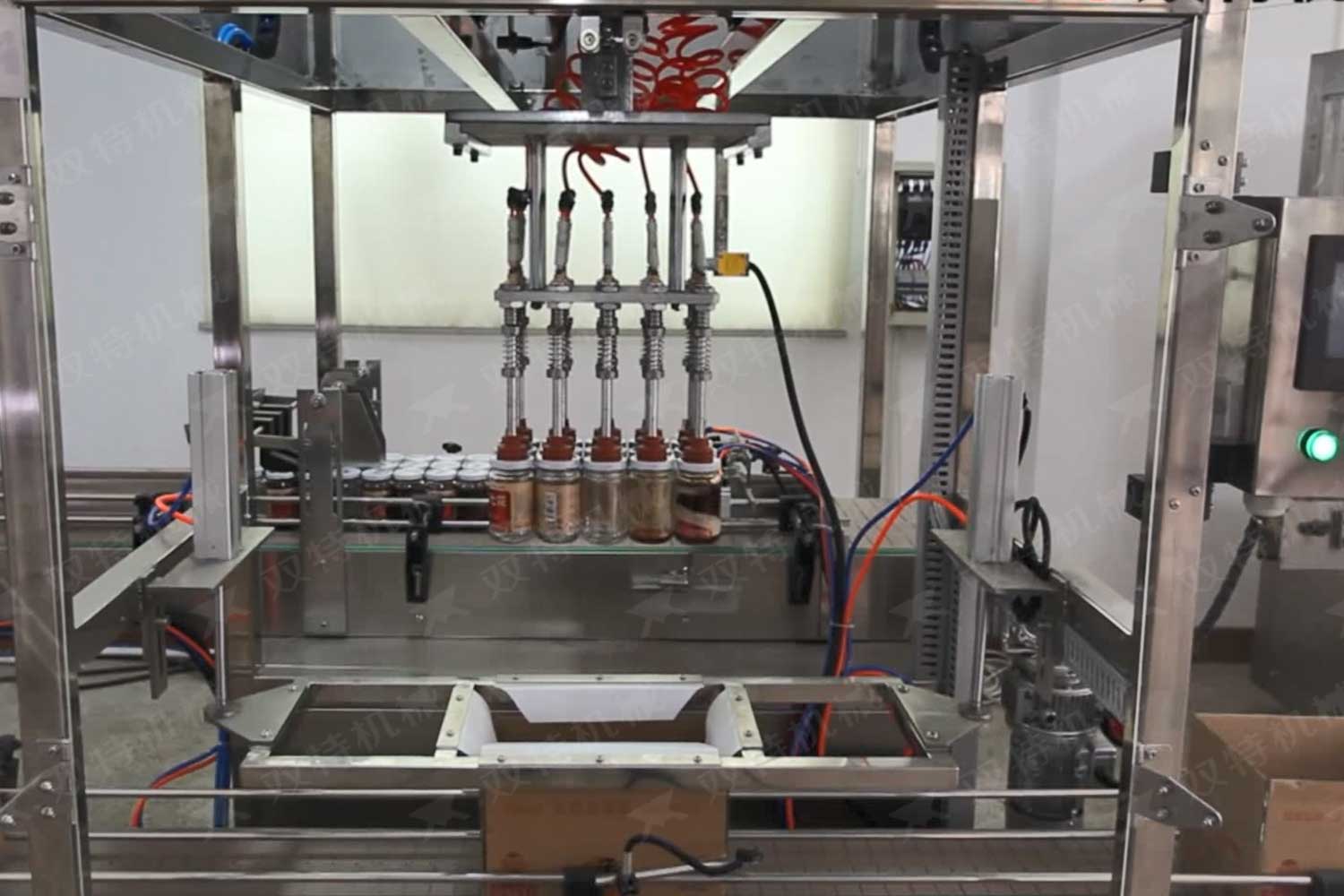 旋盖机主要用于玻璃广口瓶的三、四、六铁盖真空旋盖,用两根不同速度的皮带压瓶盖,因两根皮带的速度不同,对盖进行搓盖收紧达到旋盖目的。在自动上盖之前对瓶口吹蒸汽加热,吹掉冷空气,换上高温蒸汽,立即旋盖,根据热胀冷缩原理,蒸汽冷下来就自然形成了瓶内真空,达到了真空旋盖的目的。自动旋盖机可以和浓酱香蕉视频免费下载、蜂蜜香蕉视频免费下载、辣椒酱香蕉视频免费下载组合在一起,形成一套全自动灌装设备,是现代调味品企业的得力帮手。
